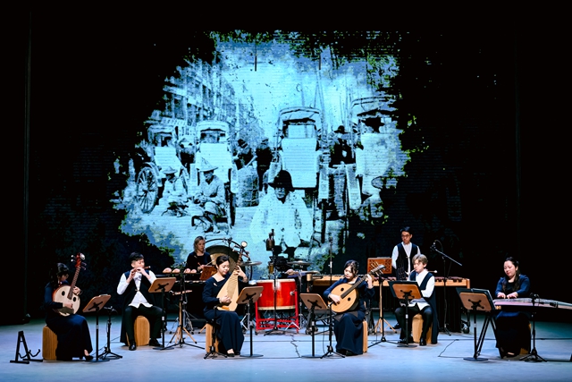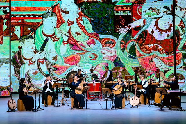 乐团以“古谱新声”为核心理念,将敦煌壁画中的音乐符号转化为现代交响语言,创新演绎让敦煌壁画“活”起来。开篇曲目《大唐礼赞》以琵琶、箜篌、阮、笛子、笙配合敲击乐器,再现敦煌榆林窟第25窟《观无量寿经变》中的盛唐气象;《三兽组曲》通过《腾骧》《白兔捣藻》《乐意寓静观》三个乐章,将莫高窟壁画第428窟、第407窟及九色鹿故事中的神兽形象转化为跳跃的音符,为文物形象赋予了声音;《阳关三叠》以仿唐乐器作为乐队编制,以现代编曲手法加以拼贴;《水鼓子》复原敦煌古谱第25首曲谱,作曲家甘圣希用17世纪巴洛克时期西方的音乐形式,创作出这首中西融合独特的乐曲,营造出敦煌壁画中生活化与轻松自在的意境。特别创作曲目《莫高精神》采用敦煌古谱旋律,致敬一代代敦煌守护者。音乐会巧妙融合丝路多元文化元素,明快清亮的乐音让现场观众耳目一新,沉浸在敦煌壁画奇妙的乐音意境之中。