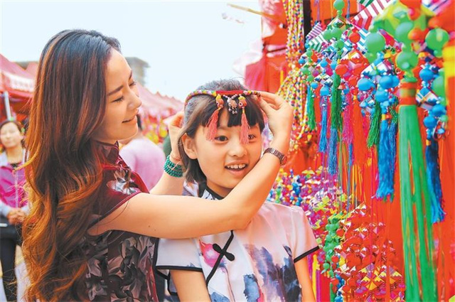 《天工开物》云:“天孙机杼,传巧人间。”端午节儿童佩挂的布艺“耍活子”的绣作,是对女孩手艺的训练。端午节这天,妇女回娘家探亲,外婆给外孙赠送佩挂的吉祥物,孩子们在这一天满脸洋溢着喜悦。